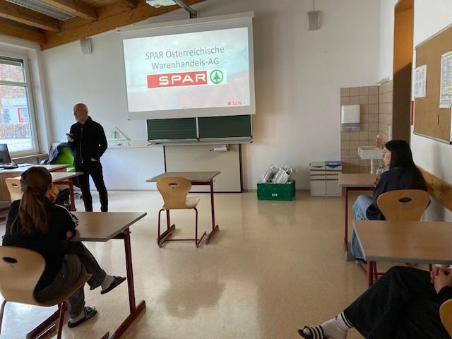In der Folge gewährte Herr Hofmaier unseren Schüler:innen Einblicke in die vielfältigen Ausbildungsmöglichkeiten in Form einer Lehre bei Spar. Sämtliche Lehrberufe samt Anforderungsprofil sowie Aufstiegsmöglichkeiten nach Abschluss der Lehre wurden vorgestellt.
